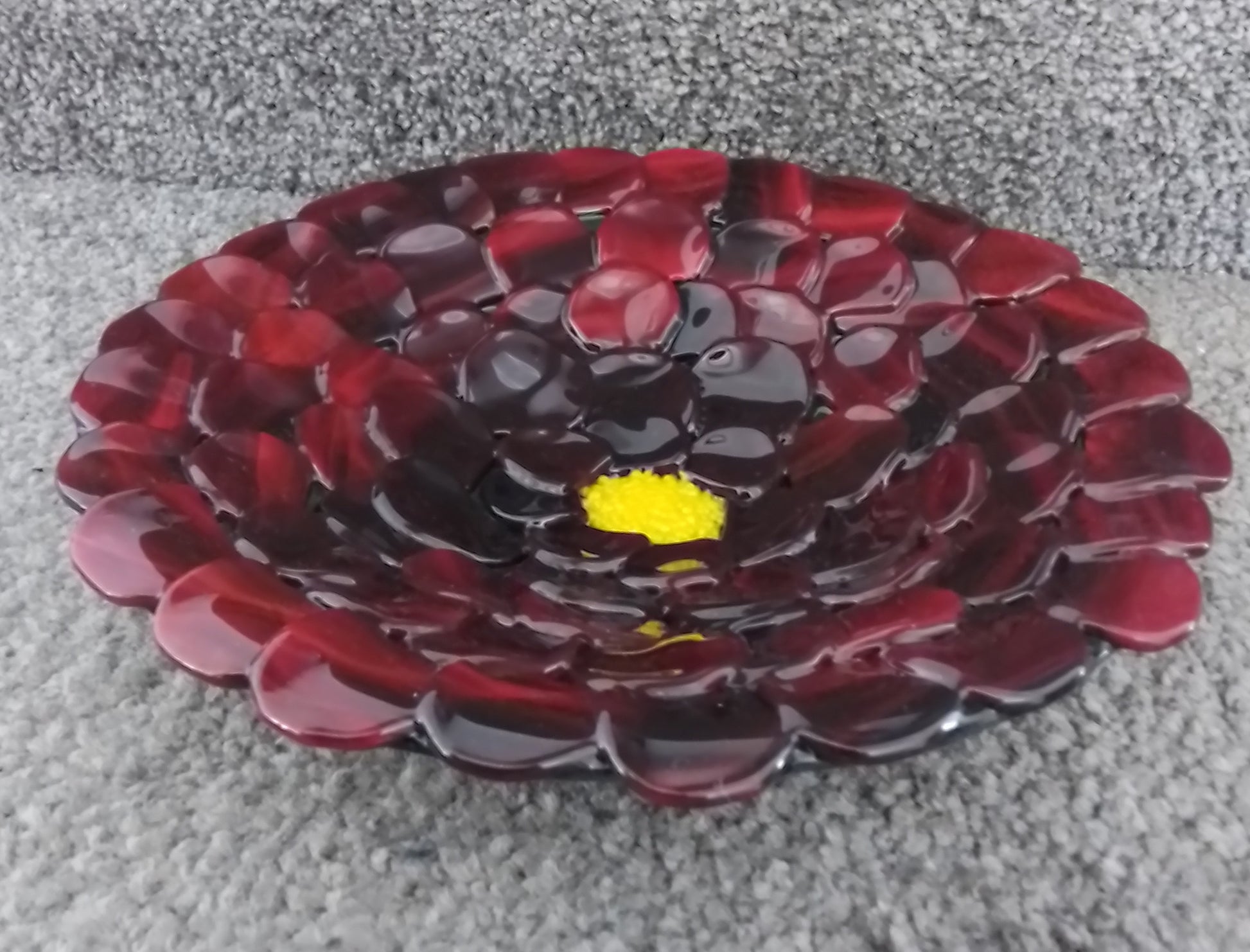 A stunning Dark Red handmade Art Glass bowl is set on a transparent green glass base with a vibrant yellow centre to give a zing to its petals.