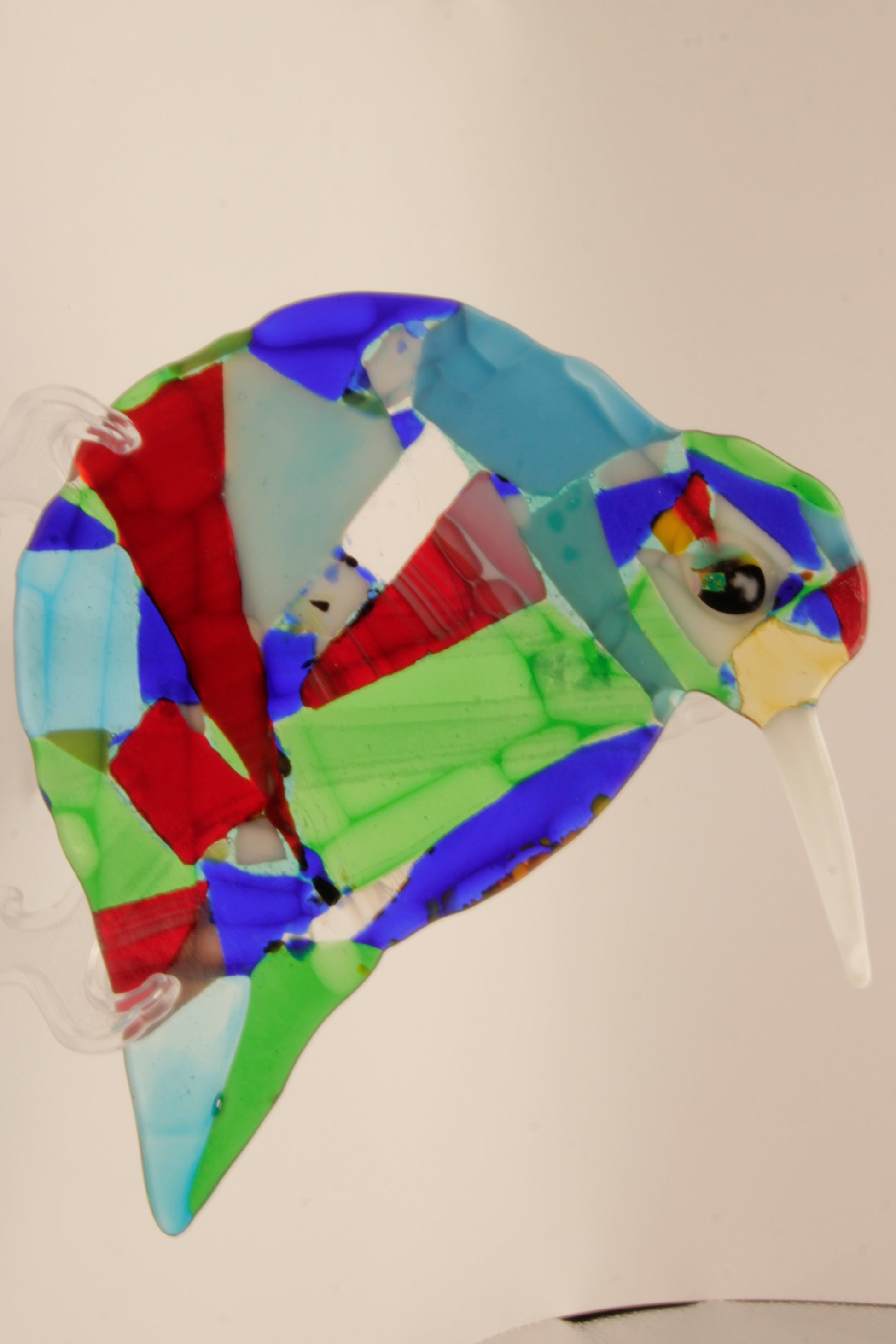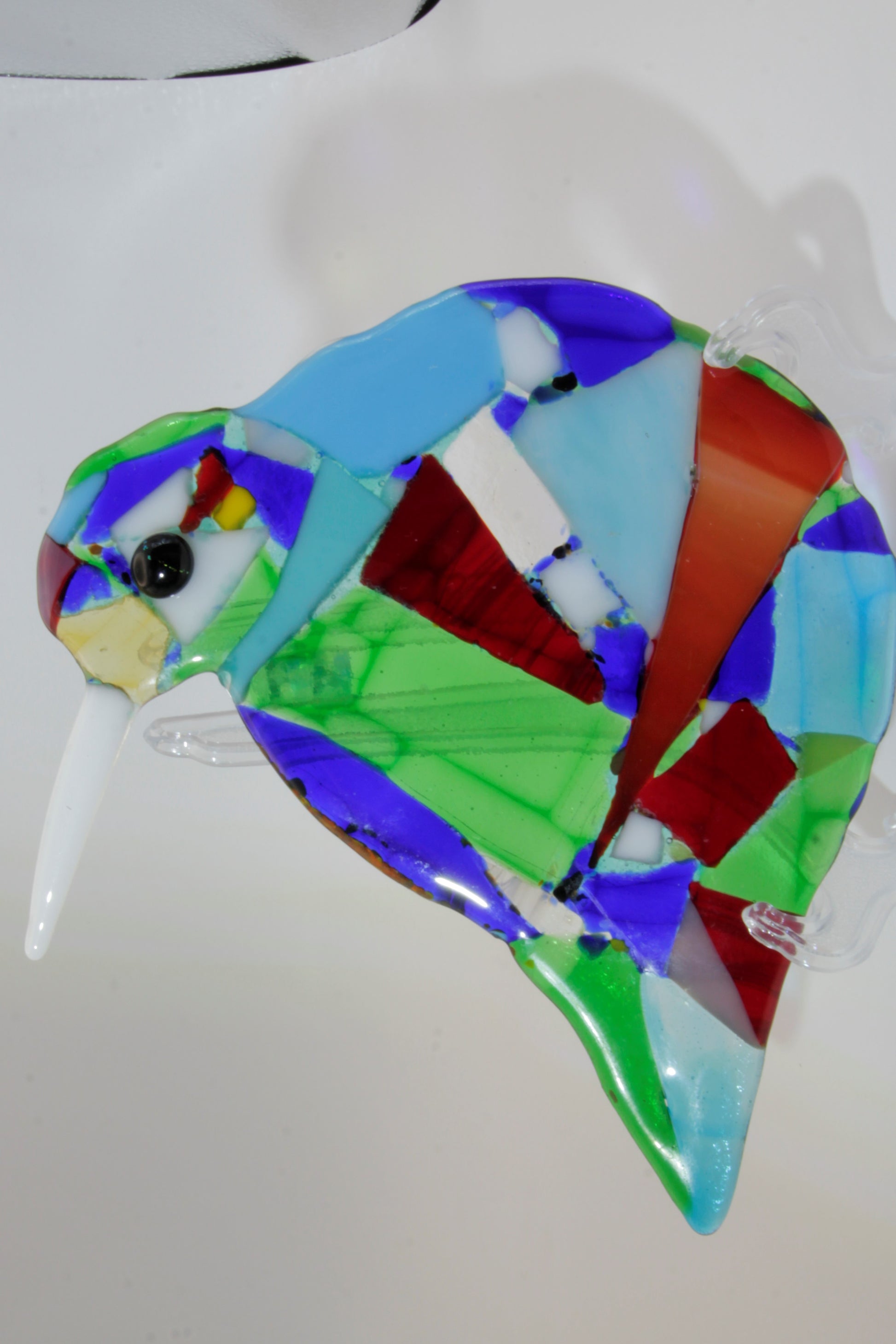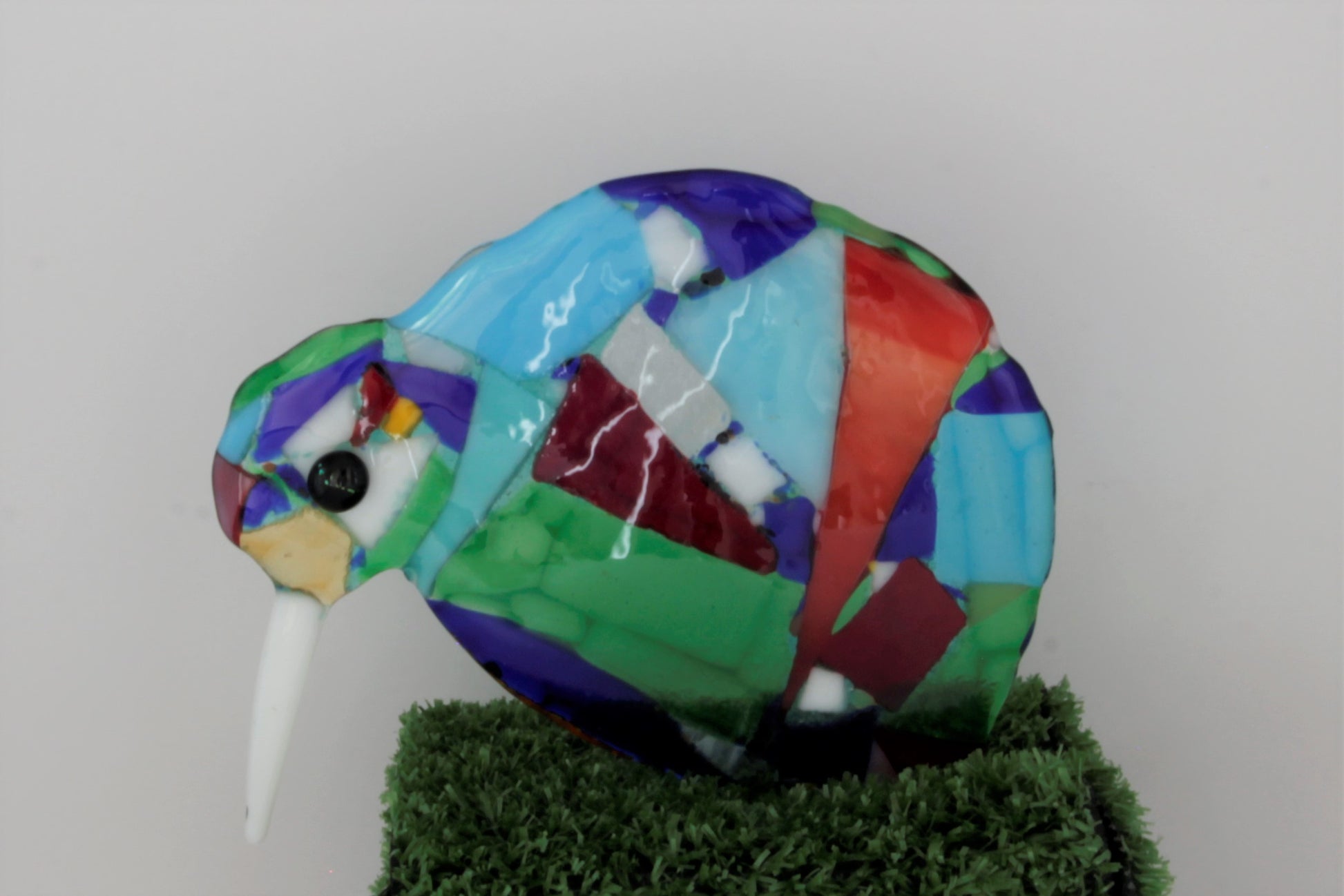 Multicoloured Glass Kiwi Garden Art. Raised eye on one side. 15cm long ( 11cm above ground ) and 15cm length to beak approx.