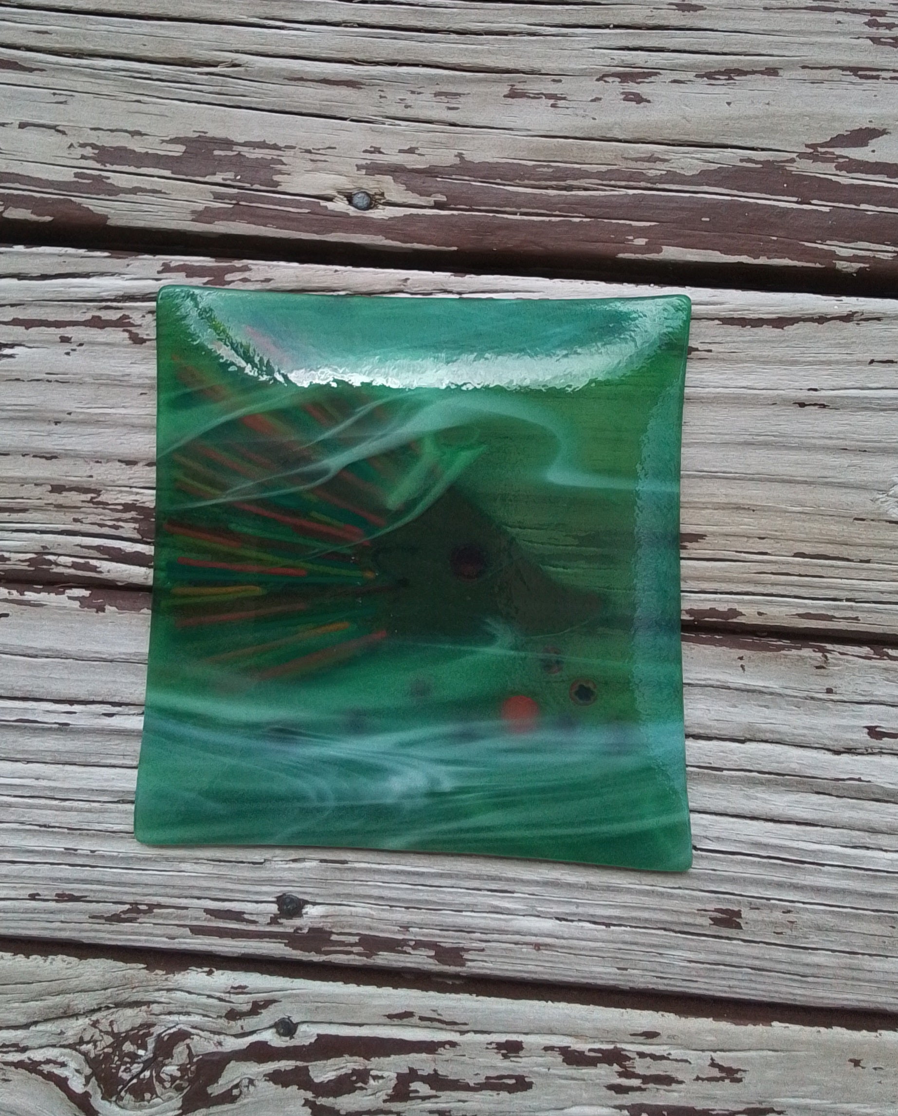 This vivid hedgehog is on a transparent green dish that has wispy white opal highlights, some of which have mellowed into pale green. The hedgehog spines are flatter than it's sister dish but just as vibrant. Hiding in plain sight amongst the flowers is a cheeky ladybird.
