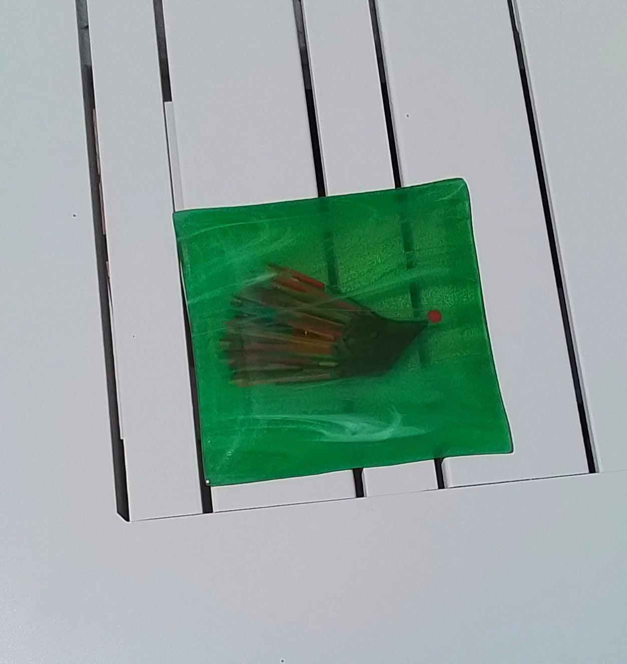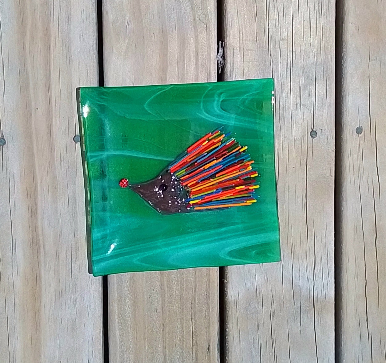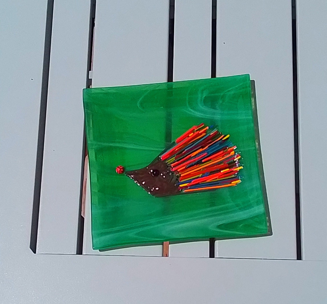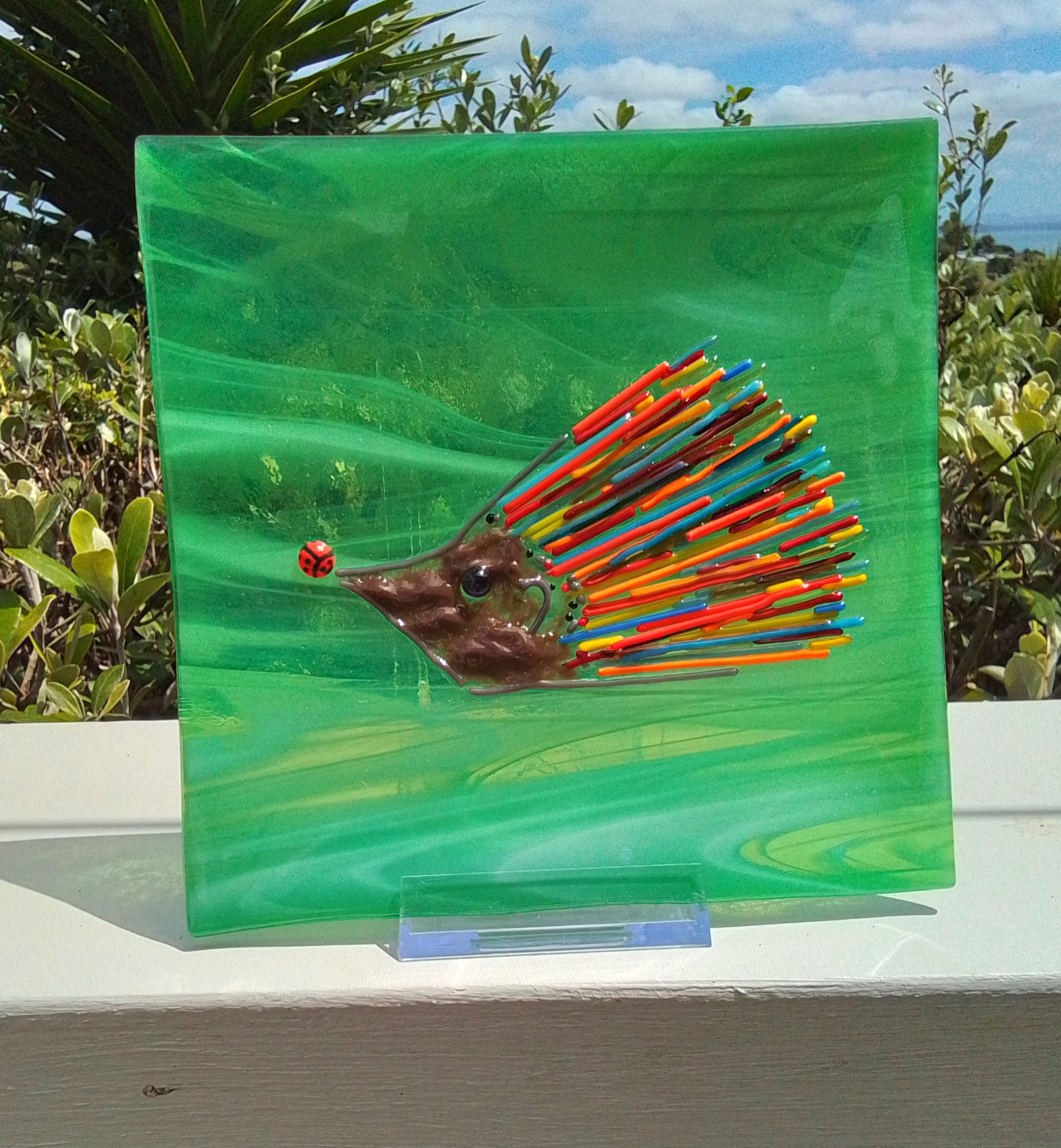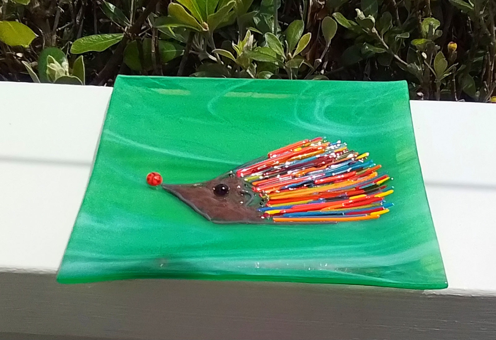 Cute dish with multicolored spine hedgehog and a ladybird resting on its nose.