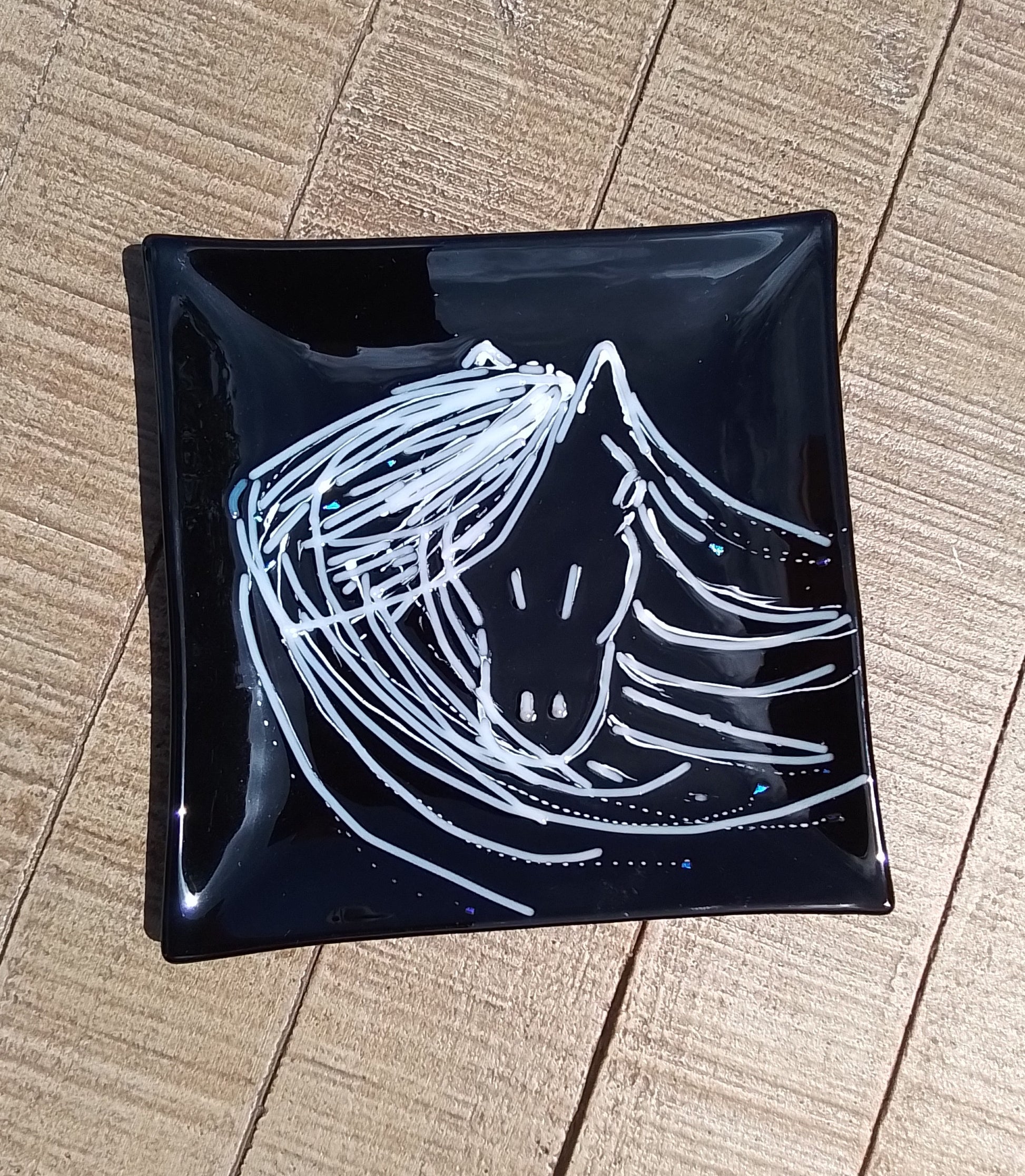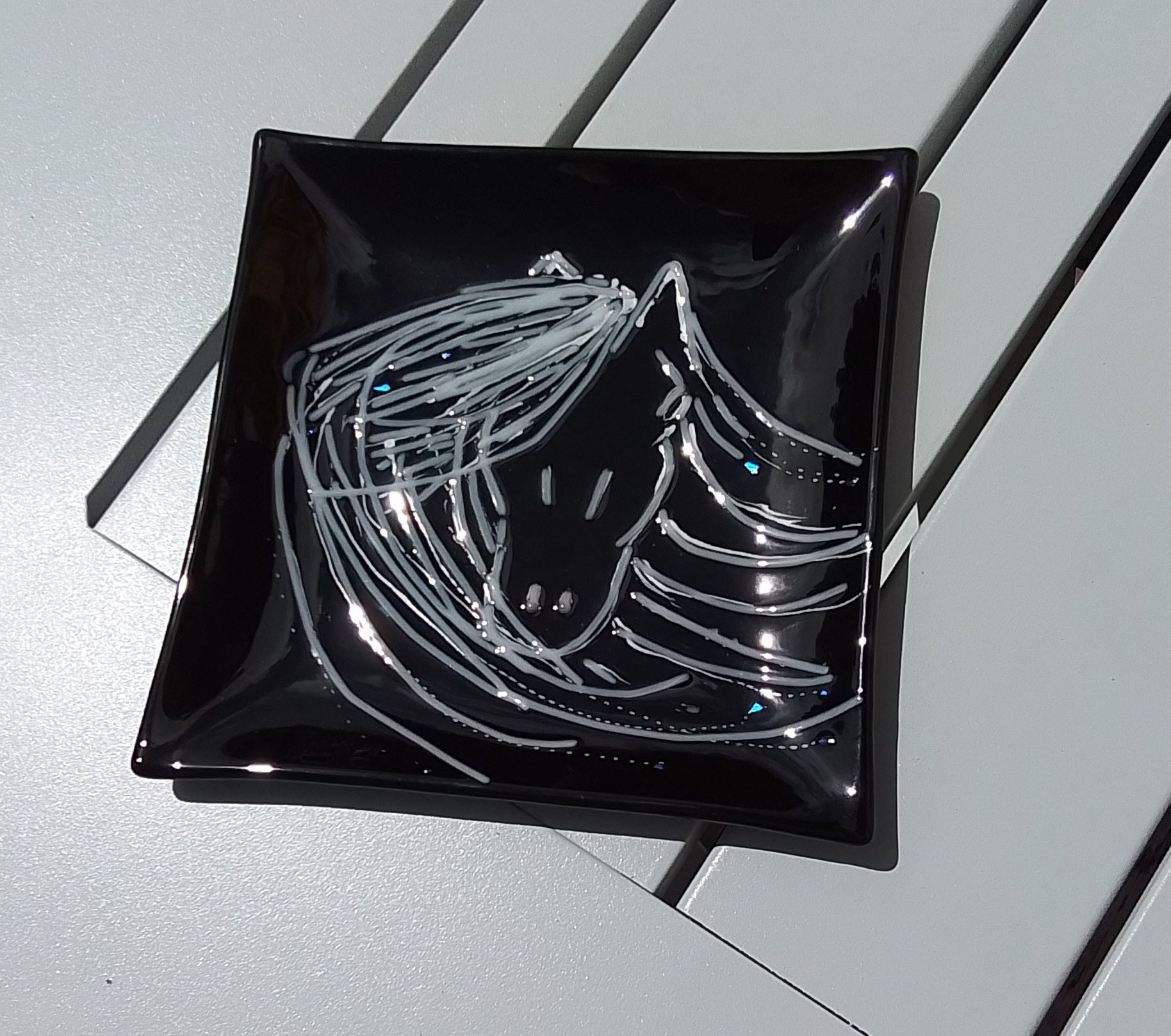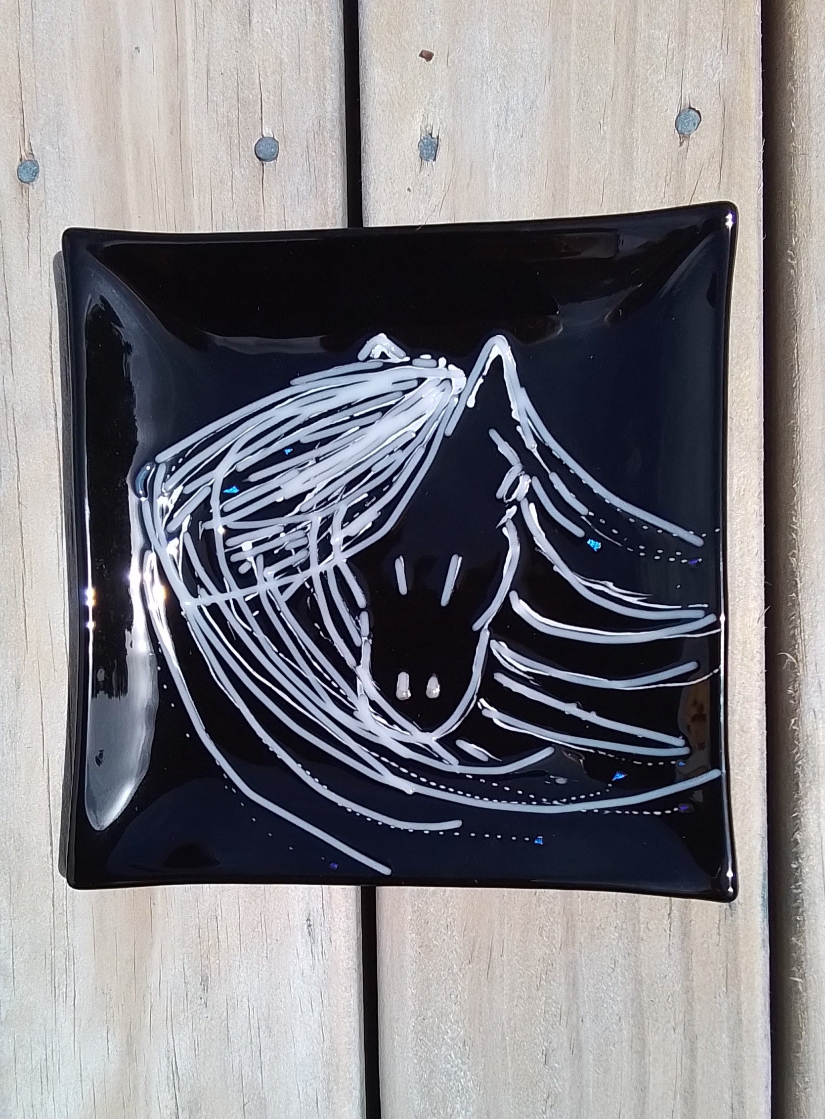 This dramatic horse sketch on black opal dish is striking in its simplicity and detail. The head and mane are white, with tiny light catching simmering electric blue details in the mane.