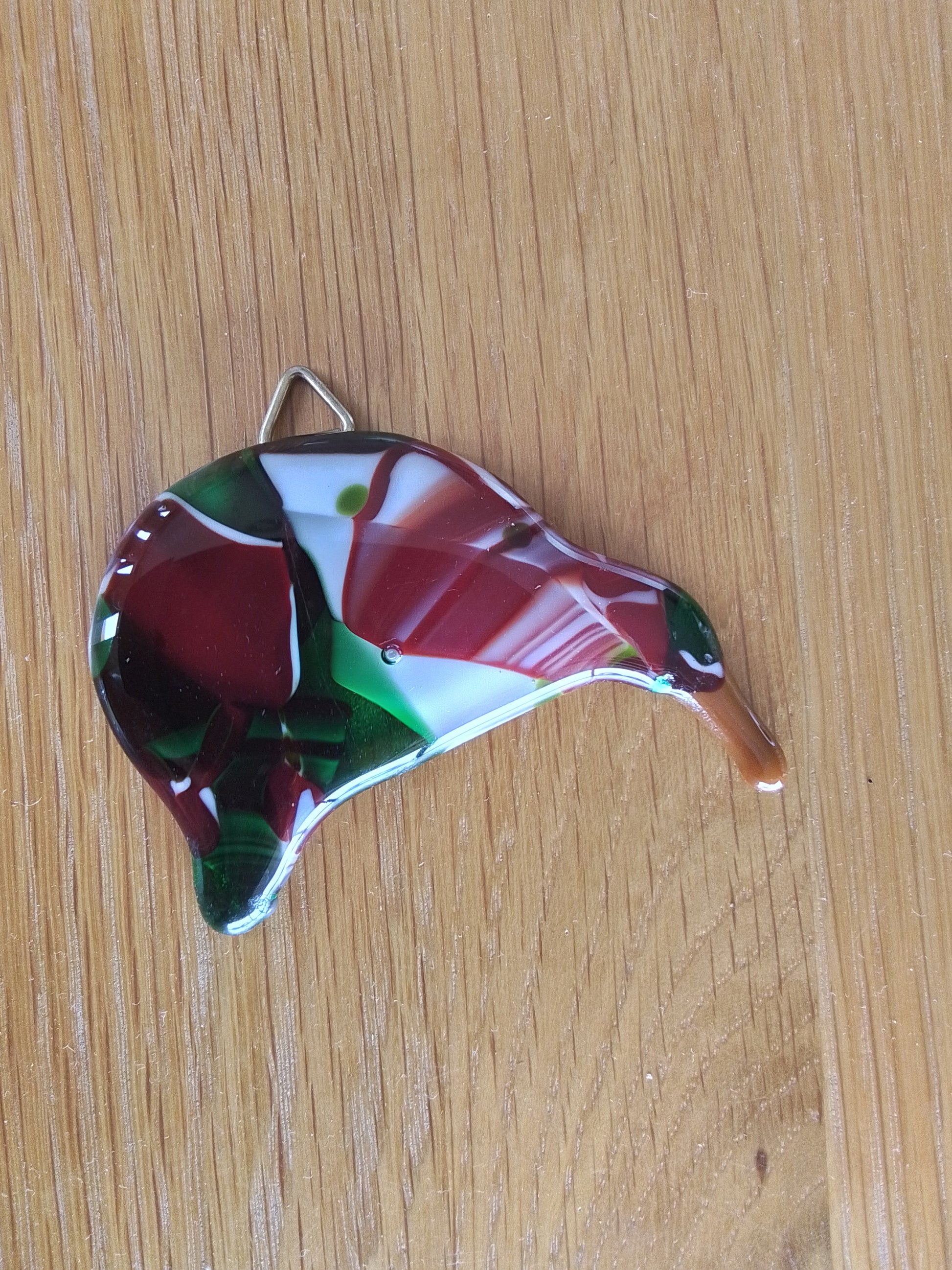 Handmade Fused Glass Kiwi Christmas Tree Ornament. In jolly red, white and green glass. Gold coloured hanger glued to back.