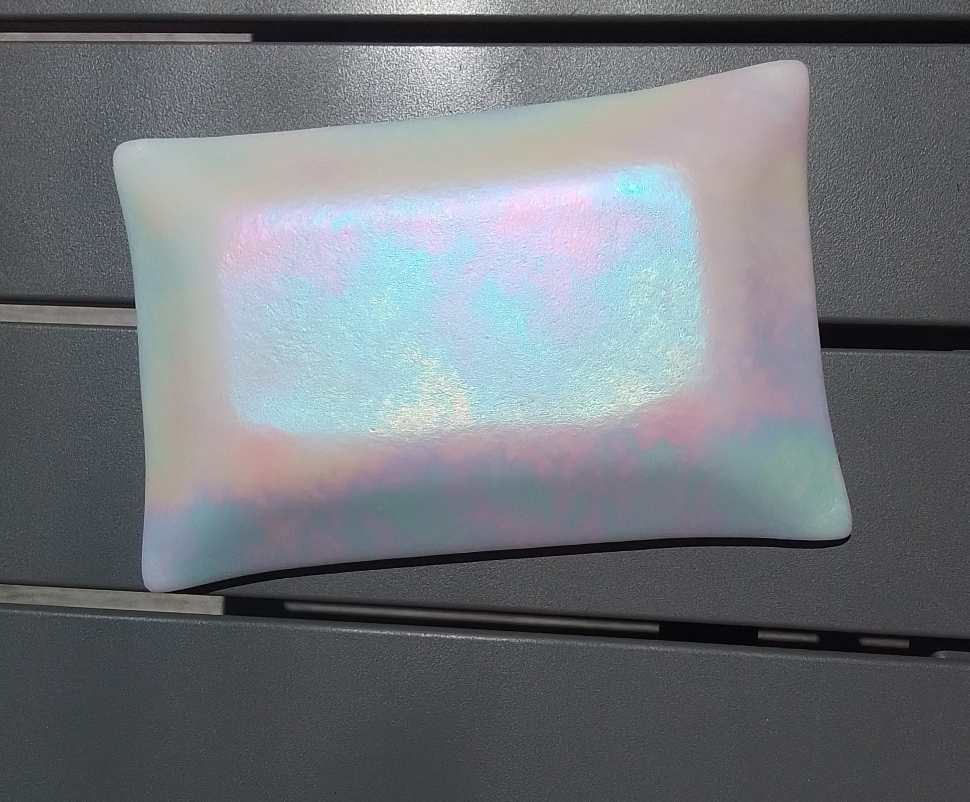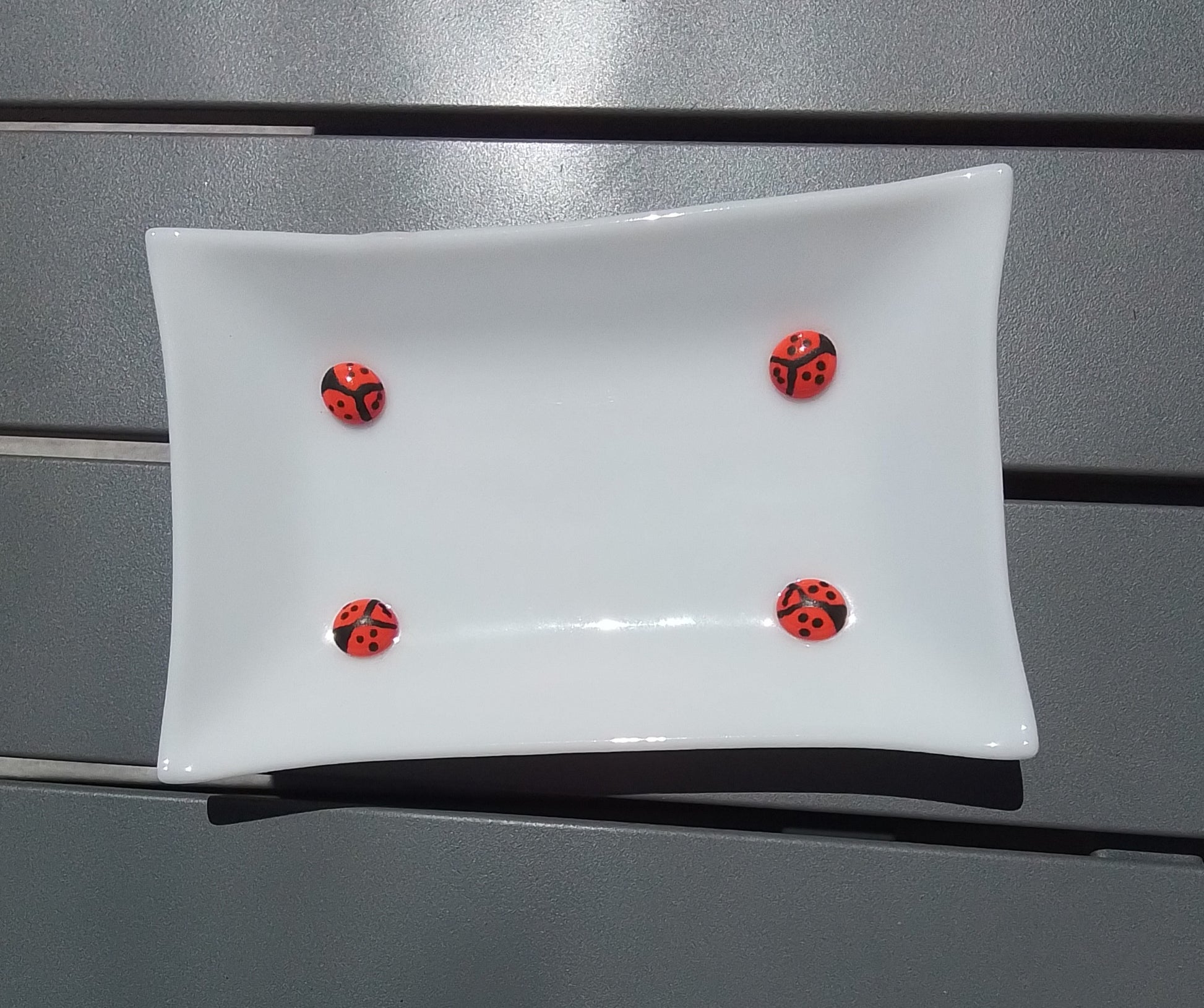 White Opal glass oblong dish with red Ladybird detail. The back is a subtle luminescent shine.