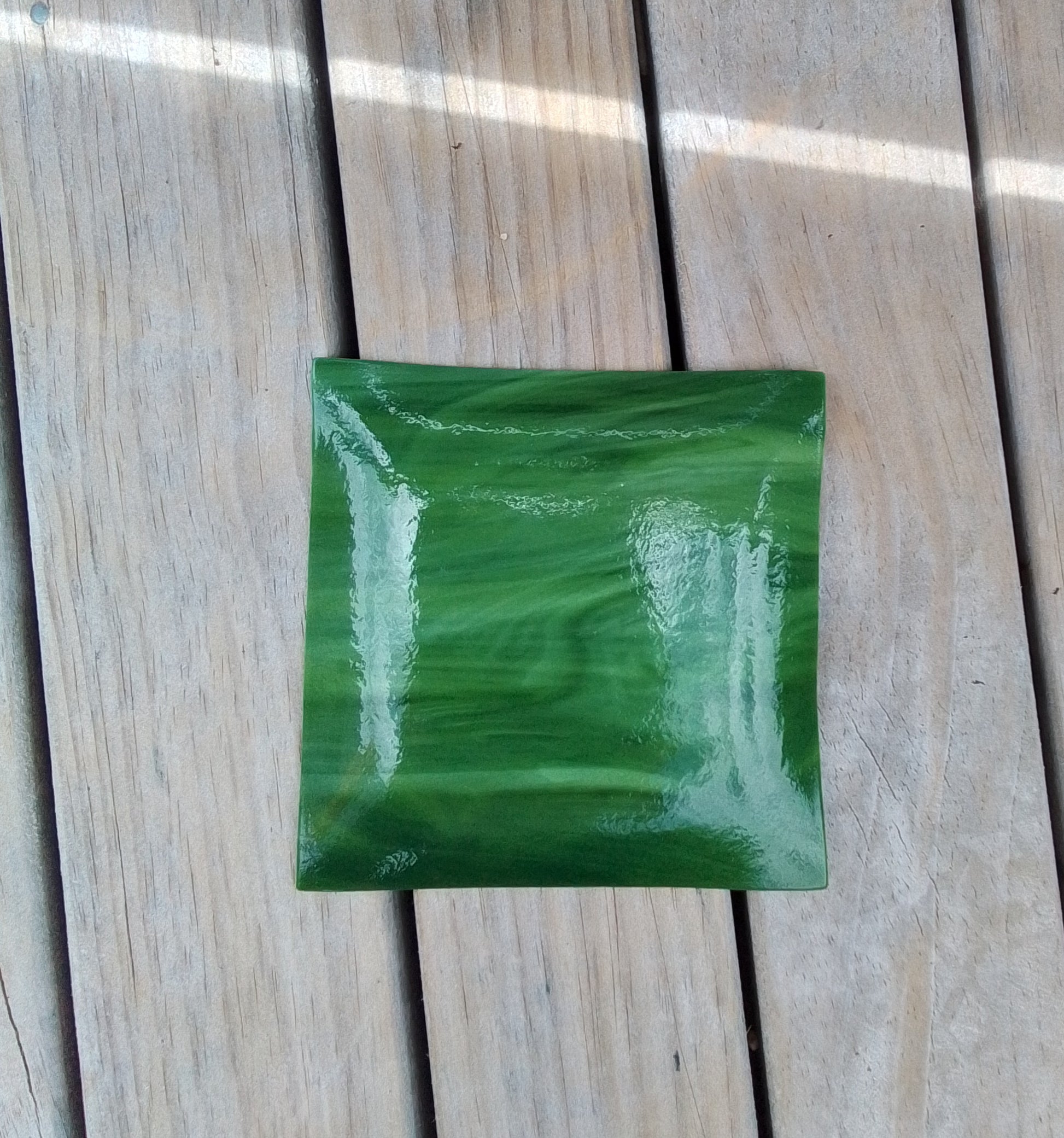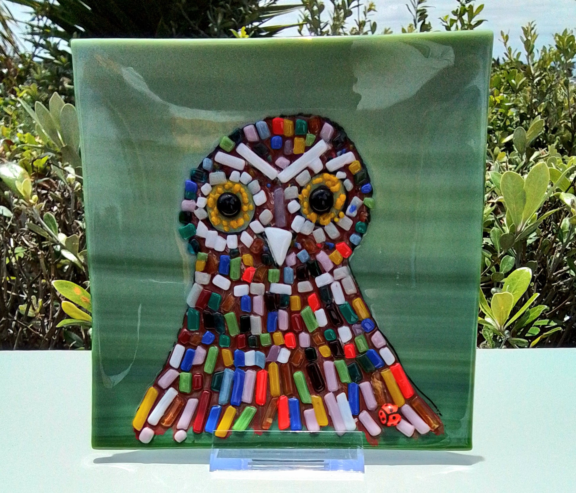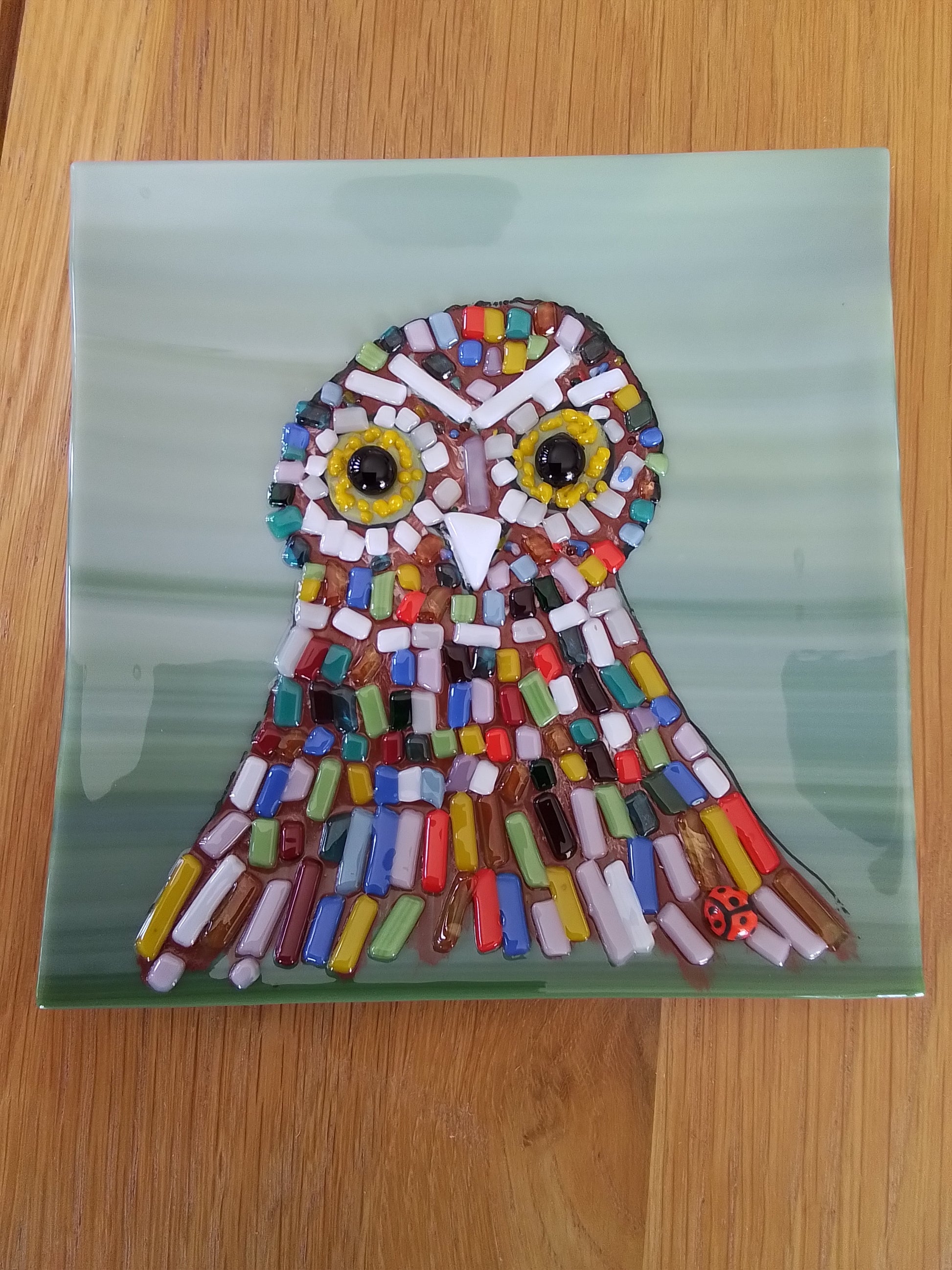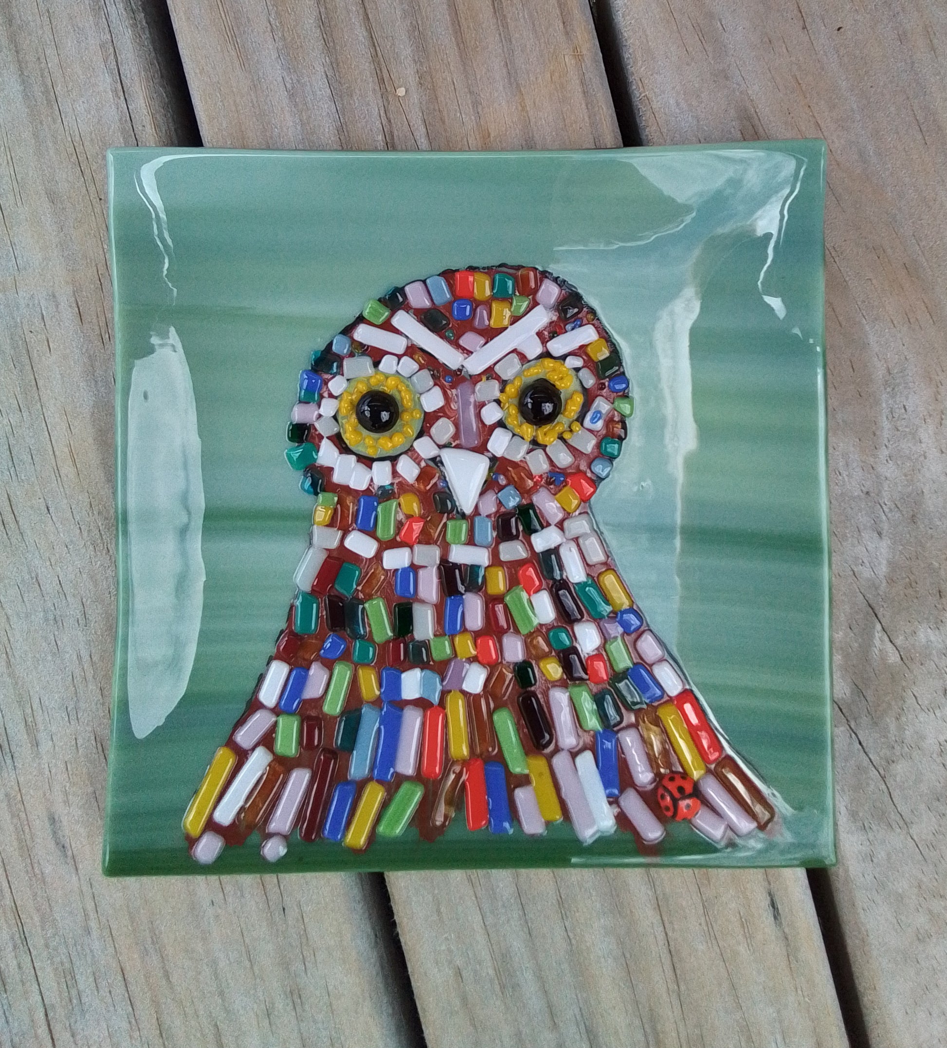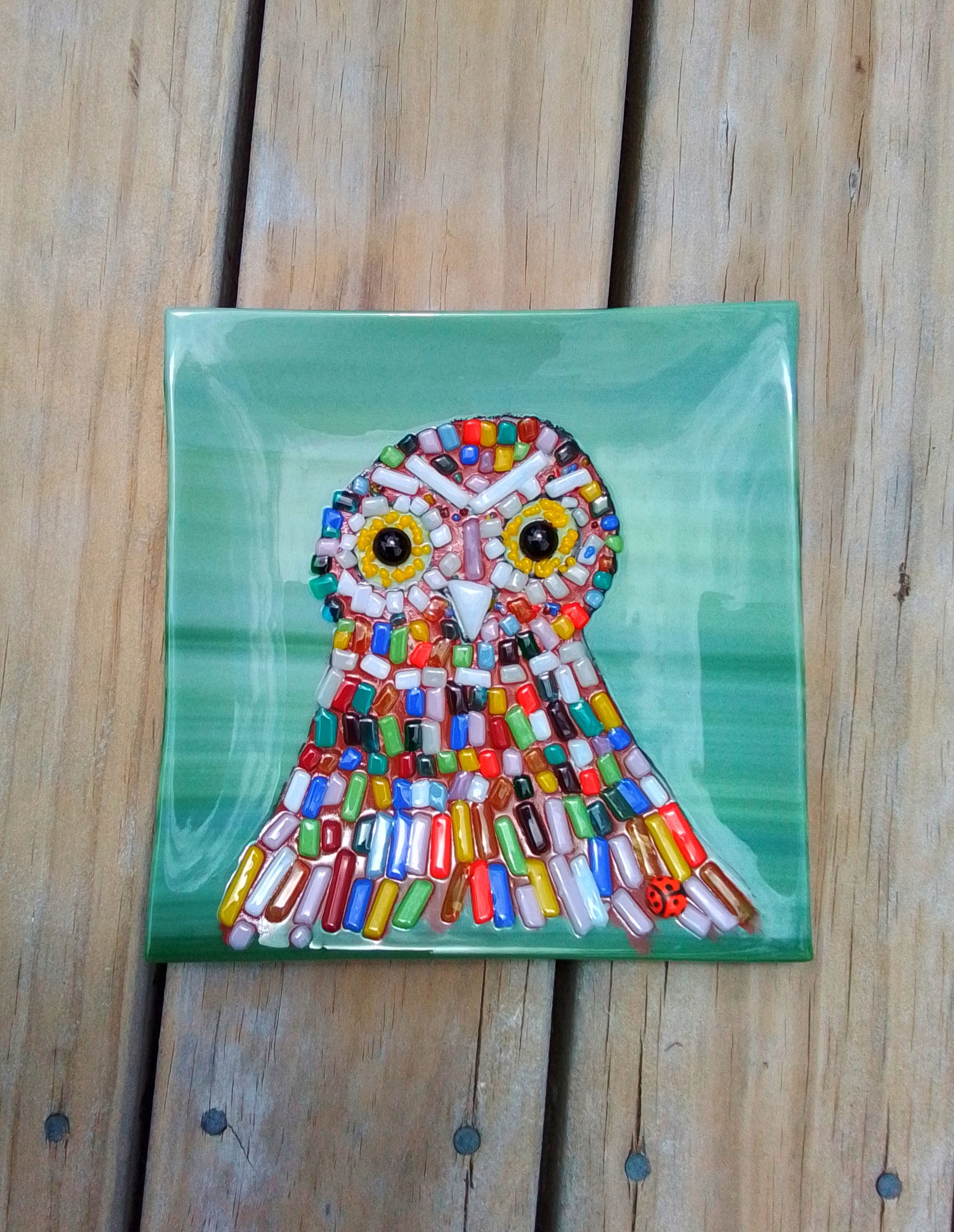 This jolly owl is in lots of bright colours. The dish is light shades of green opal glass with the reverse a more vibration green opal. There is a cheeky ladybird on the bottom right.