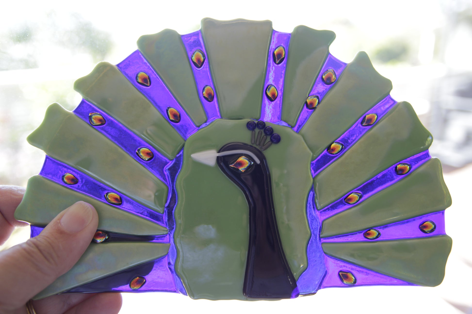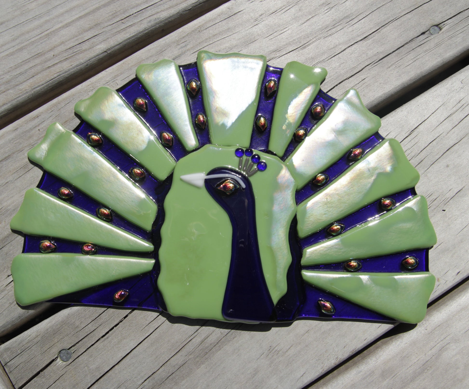 A Peacock with a Midnight Blue clear and Pale Green Opal luminescent Fused Glass fantail with colourful peacock feather detail. To be displayed on a stand ( a small unobtrusive plastic stand supplied).