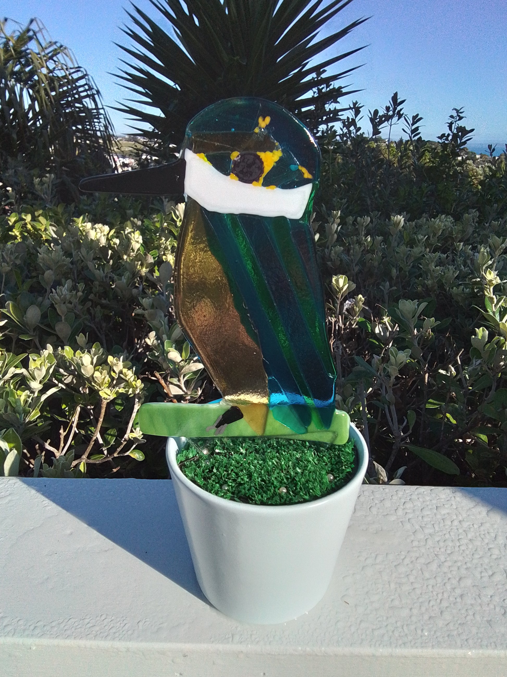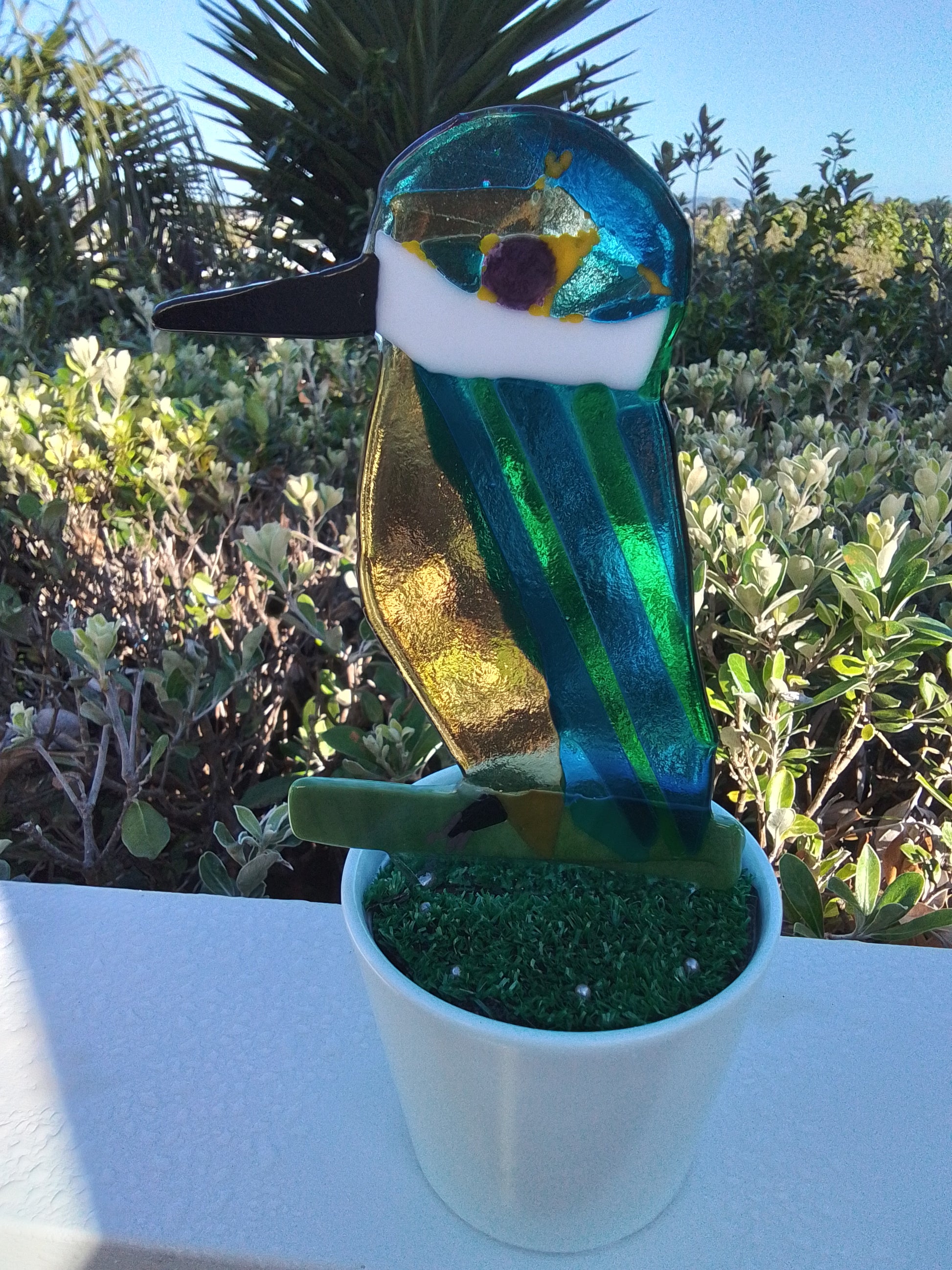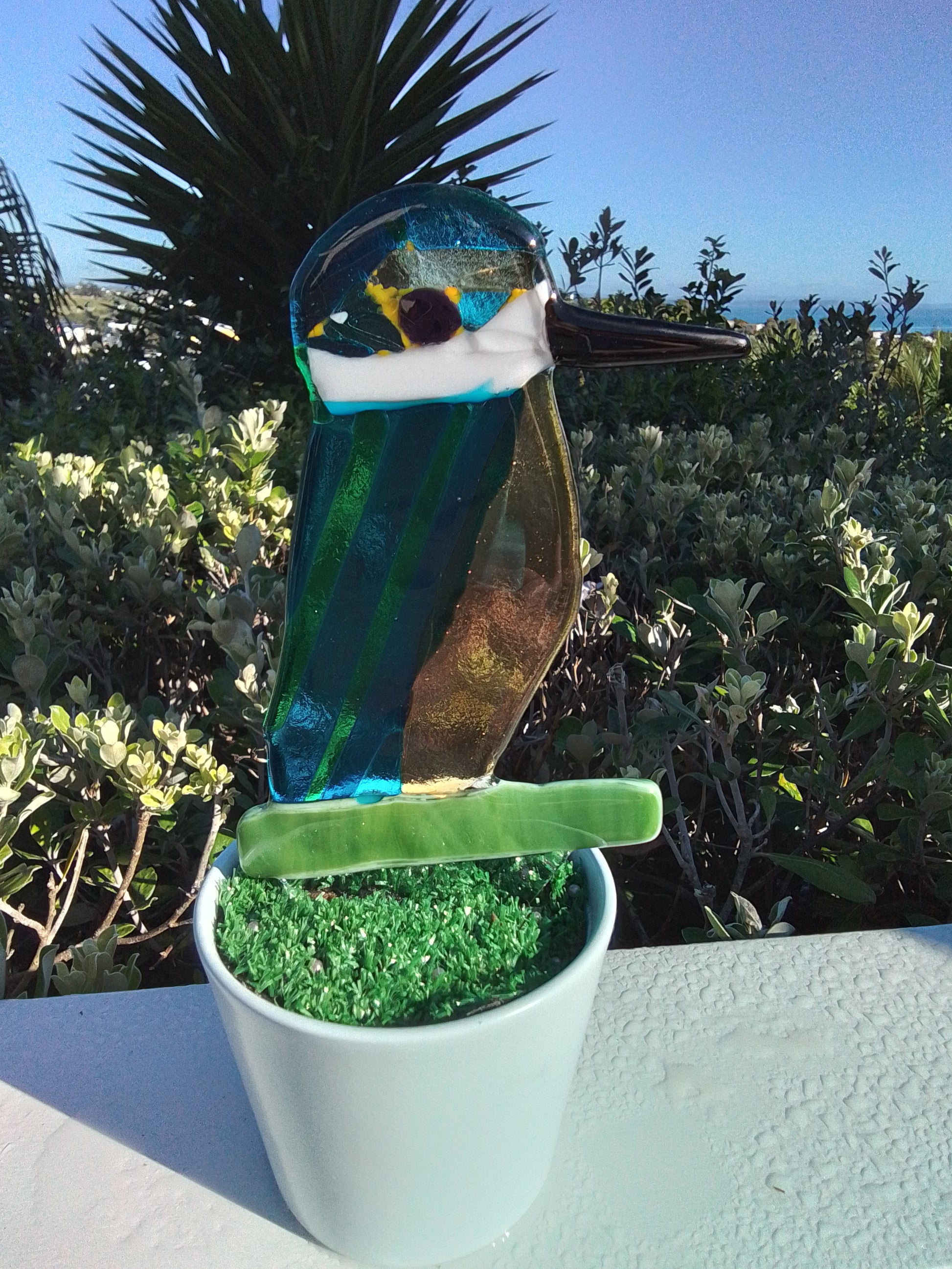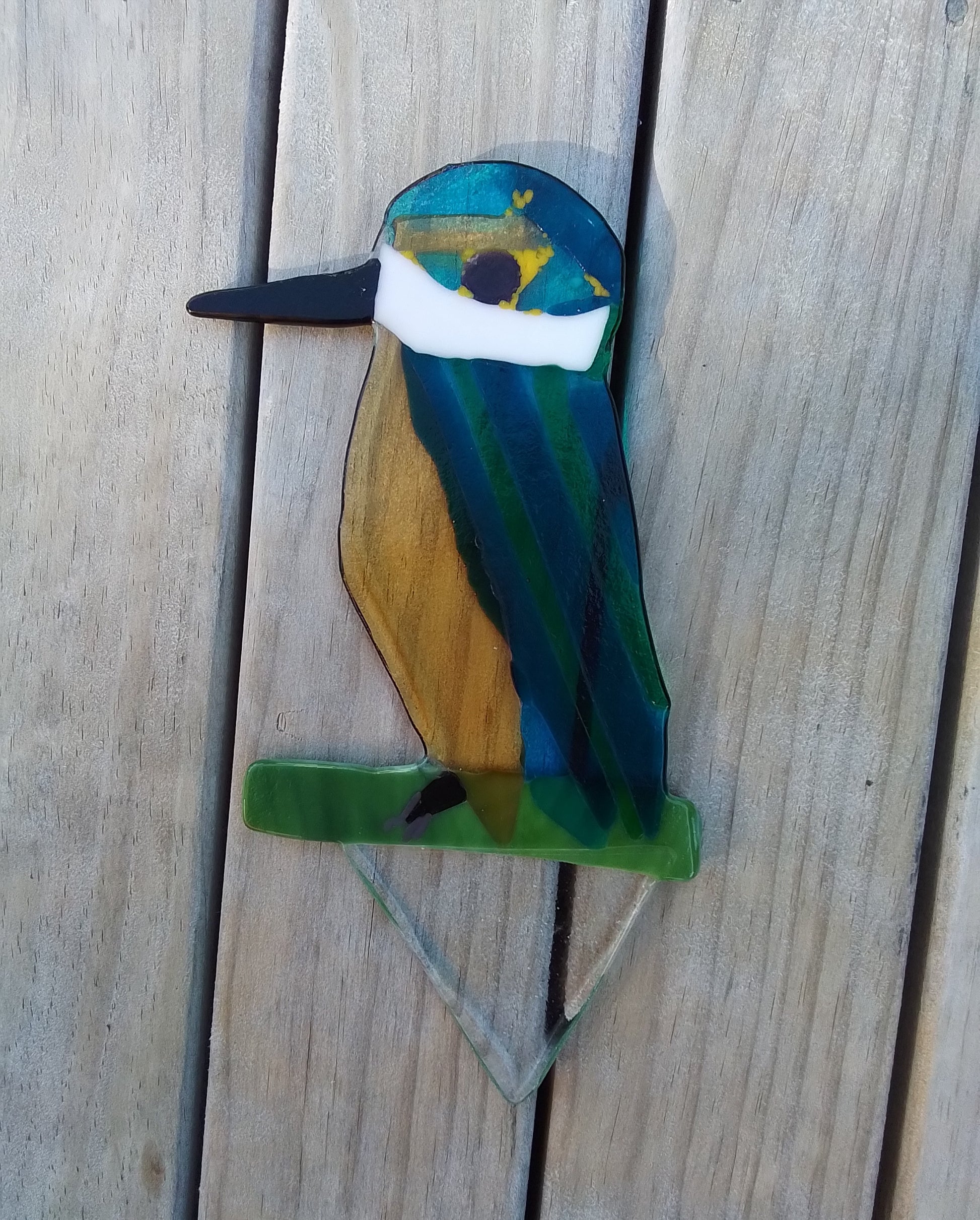 Handmade in New Zealand Fused Glass Kingfisher. Blue and green transparent glass with a yellow breast sets this young Kingfisher off delightfully. Sitting on a the grass elegantly watching the world go by, A great present fir a bird watcher...no binoculars required!