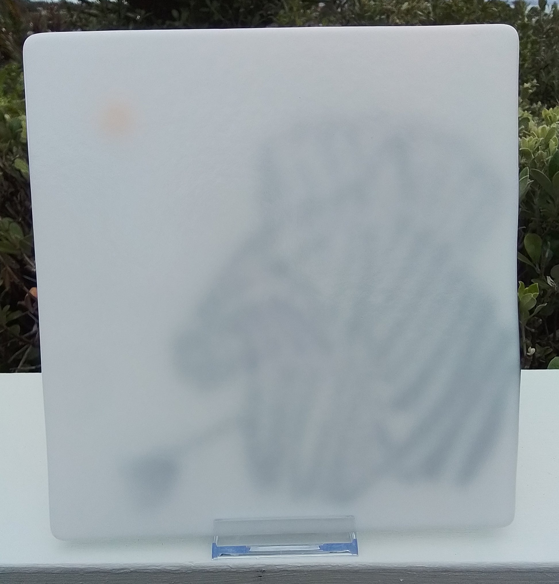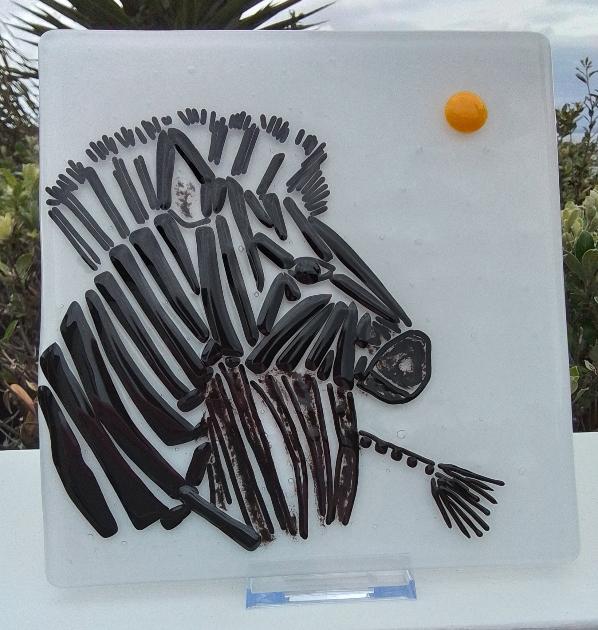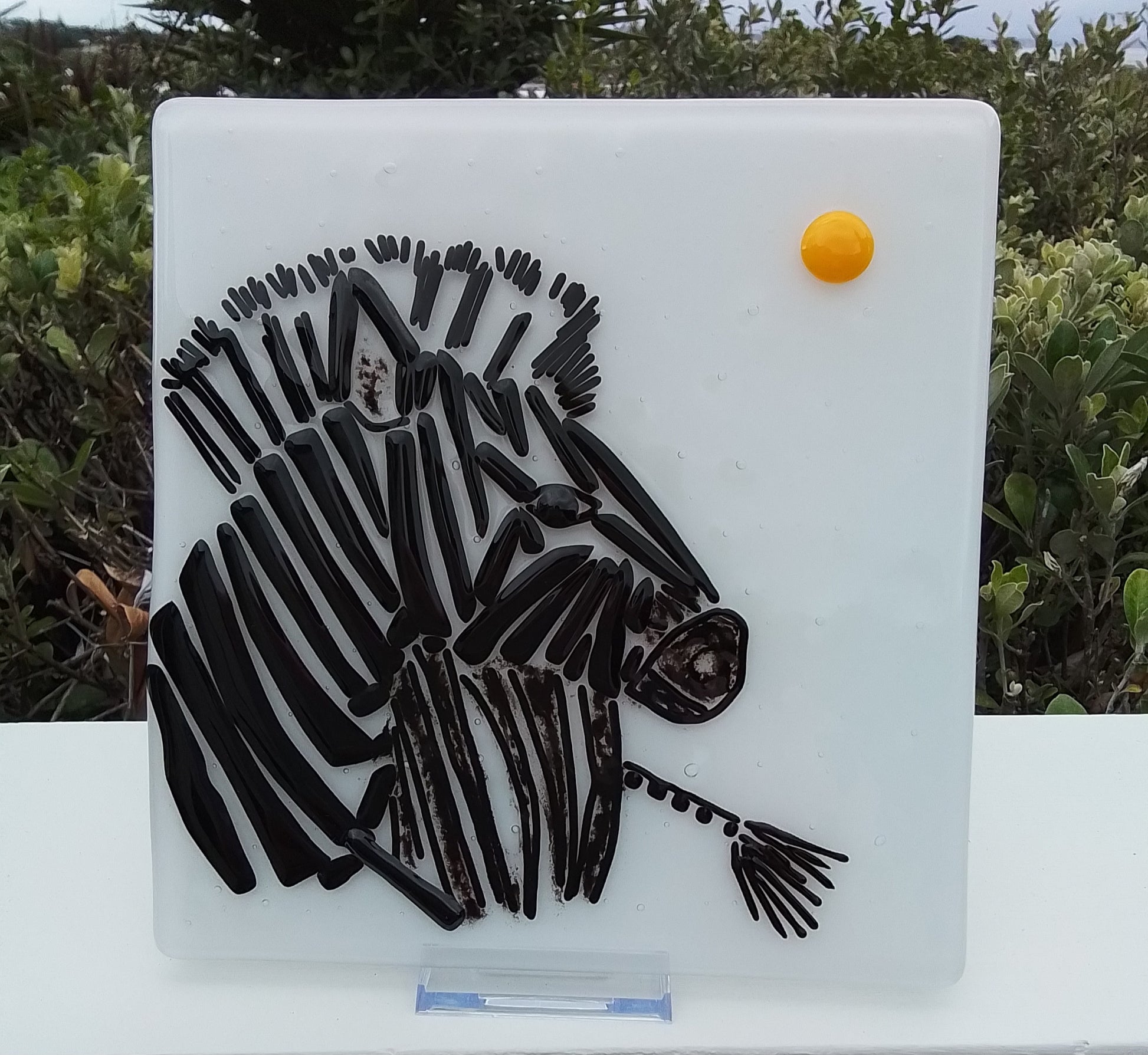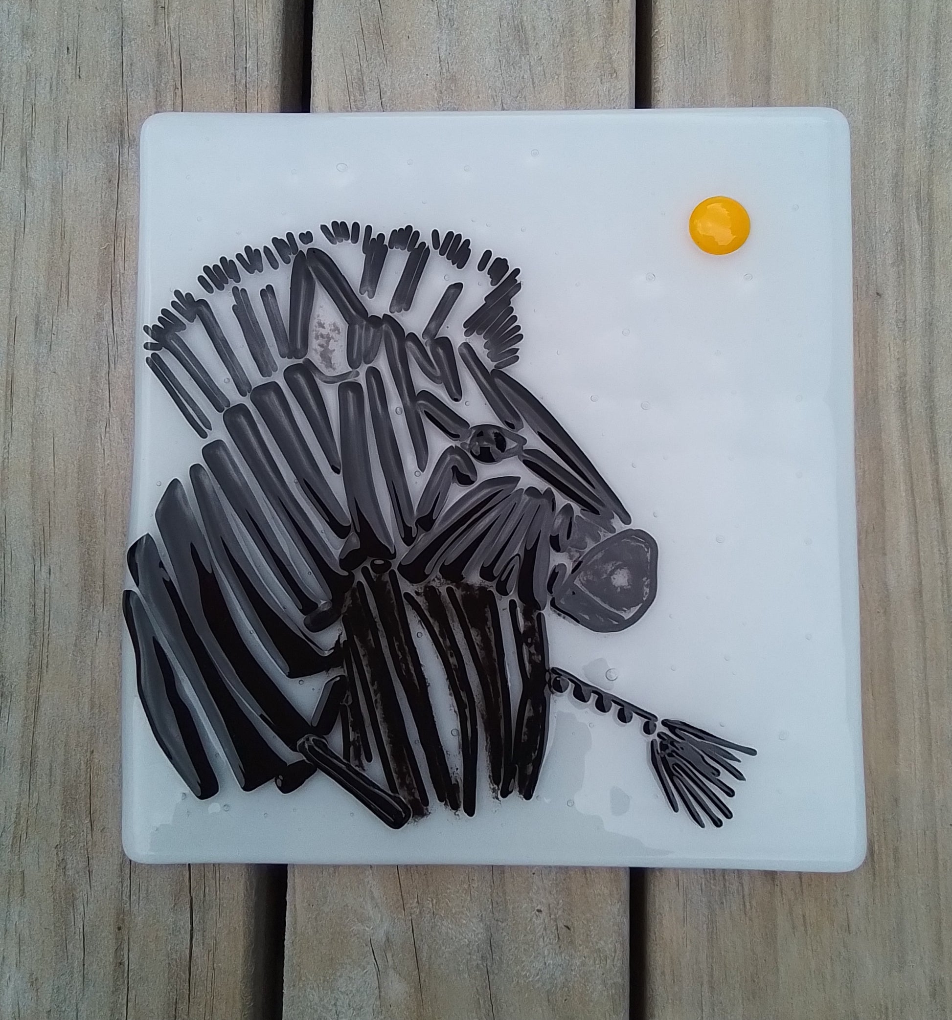 Black Zebra outline on a white background, with a pop of yellow from the sun. Fused Glass Art made in New Zealand.